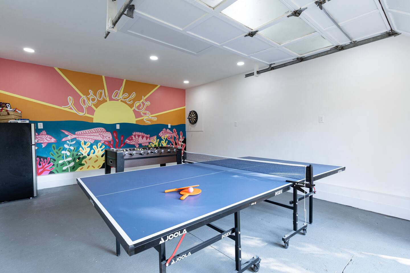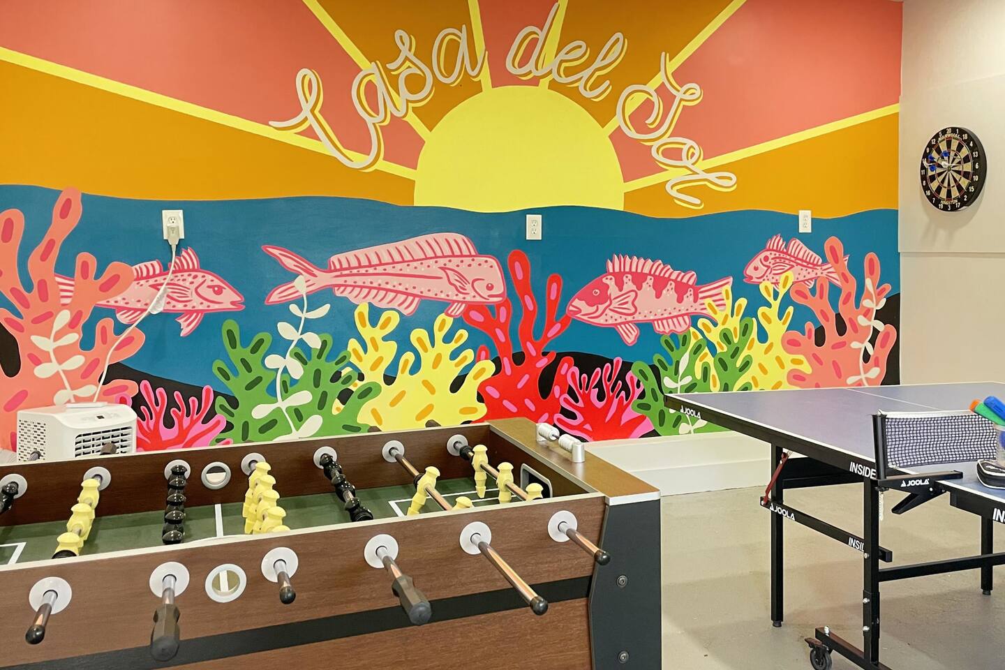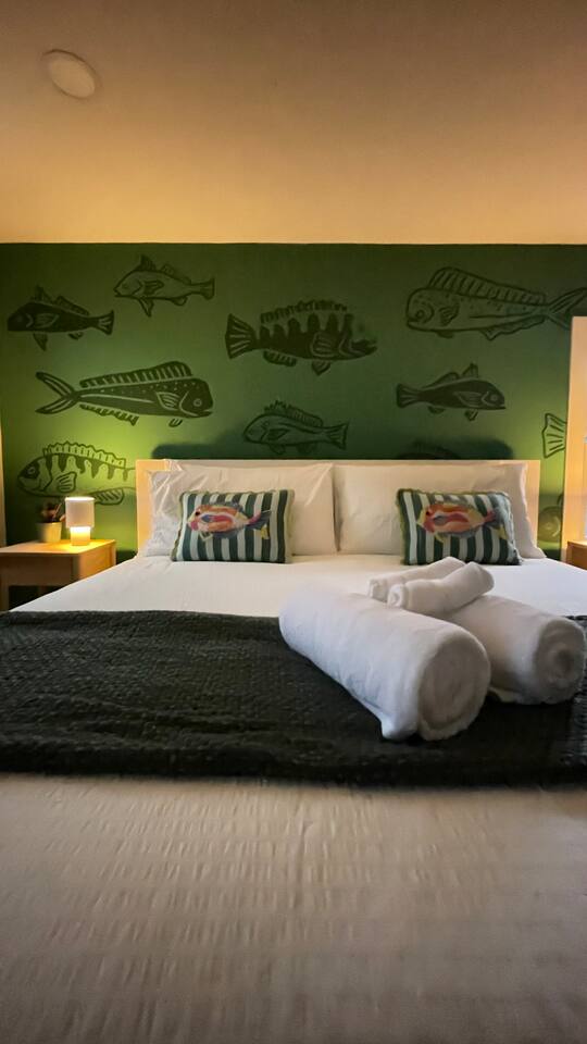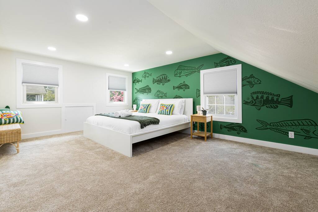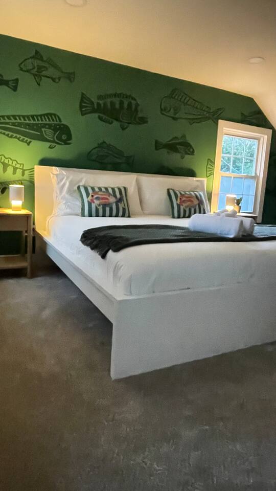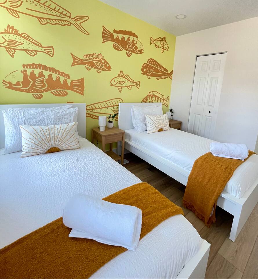 Recent renovations (Q1 2025): everything is new! Enjoy the spectacular murals with sea themes painted by local artists in the bedrooms and playroom Living Room - Large L-shaped couch - TV for entertainment - Board games - Open floor plan connecting to the dining area and kitchen - Creative coastal theme throughout Kitchen - Fully equipped with everything you need - Modern appliances - Spacious and functional - Plenty of storage space Interior Dining Area - Seating for eight Bedrooms Bedrooms feature unique murals painted by local artists. - 1st bedroom equipped with a comfortable queen-size bed - 2nd Bedroom equipped with 2 single-size beds - 3rd Bedroom (master bedroom) - Equipped with a King-size bed and a desktop. - inviting bedding for a restful night’s sleep - The Sofa Bed in the TV room can also be used, comfortable for 2 people. Bathroom - 2 Full bathrooms, one in the first floor and the master bathroom in the second floor Outdoor Area - BBQ grill for outdoor cooking - Fire pit - Corn hole game Playing room - Ping pong table - Refrigerator - Foosball table - Dart boards - TV TV room Other Areas - laundry room with washer/dryer combo - Guests are free to use all the space of the property!